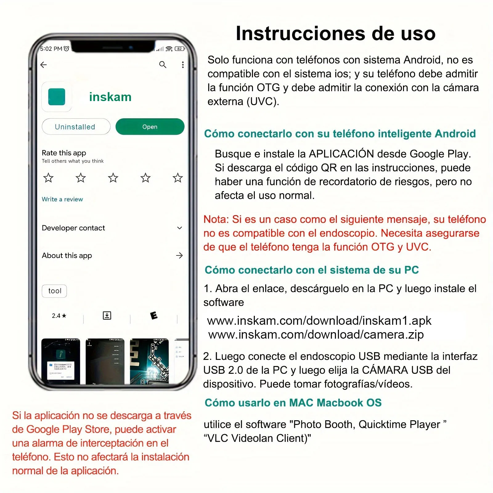 1. On Android phone:Scan the QR code on the Manual to install APP, or from CD install APP, or download link to install APP,then an icon appears on mobile desktop, click on the icon, the product is available to use.It's very easy to operate this android endoscope, just download an APPand inserted the endoscope in your device, the APP will automatic recognition it , then start to use !(Please make sure your phone has OTG function and supports external camera.)
